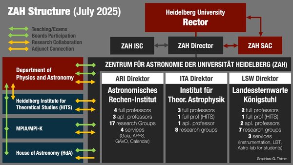 Beside its organisational structure this diagram visualizes ZAH’s intensive interaction with other parts of Heidelberg University and local research institutes. This interaction is most intensive with the Department of Physics and Astronomy. ZAH scientists contribute to the department's teaching curriculum with regular and special astronomy or astrophysics courses or as lecturers in regular physics courses or in physics tutorials. Apart from this connection ZAH scientists are members of various committees and boards of the department.
